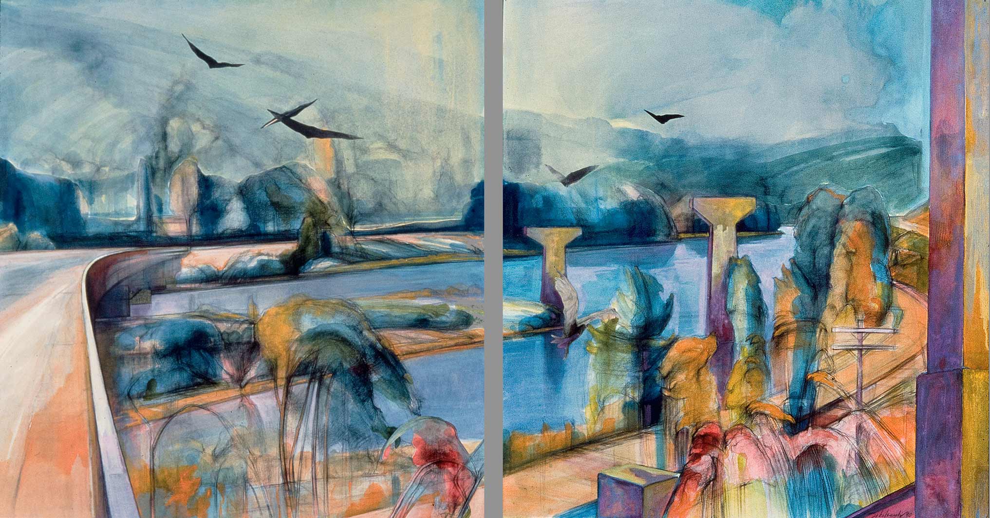 " Abandoned Space", oil and collage on paper, each panel of diptych 42"X40"